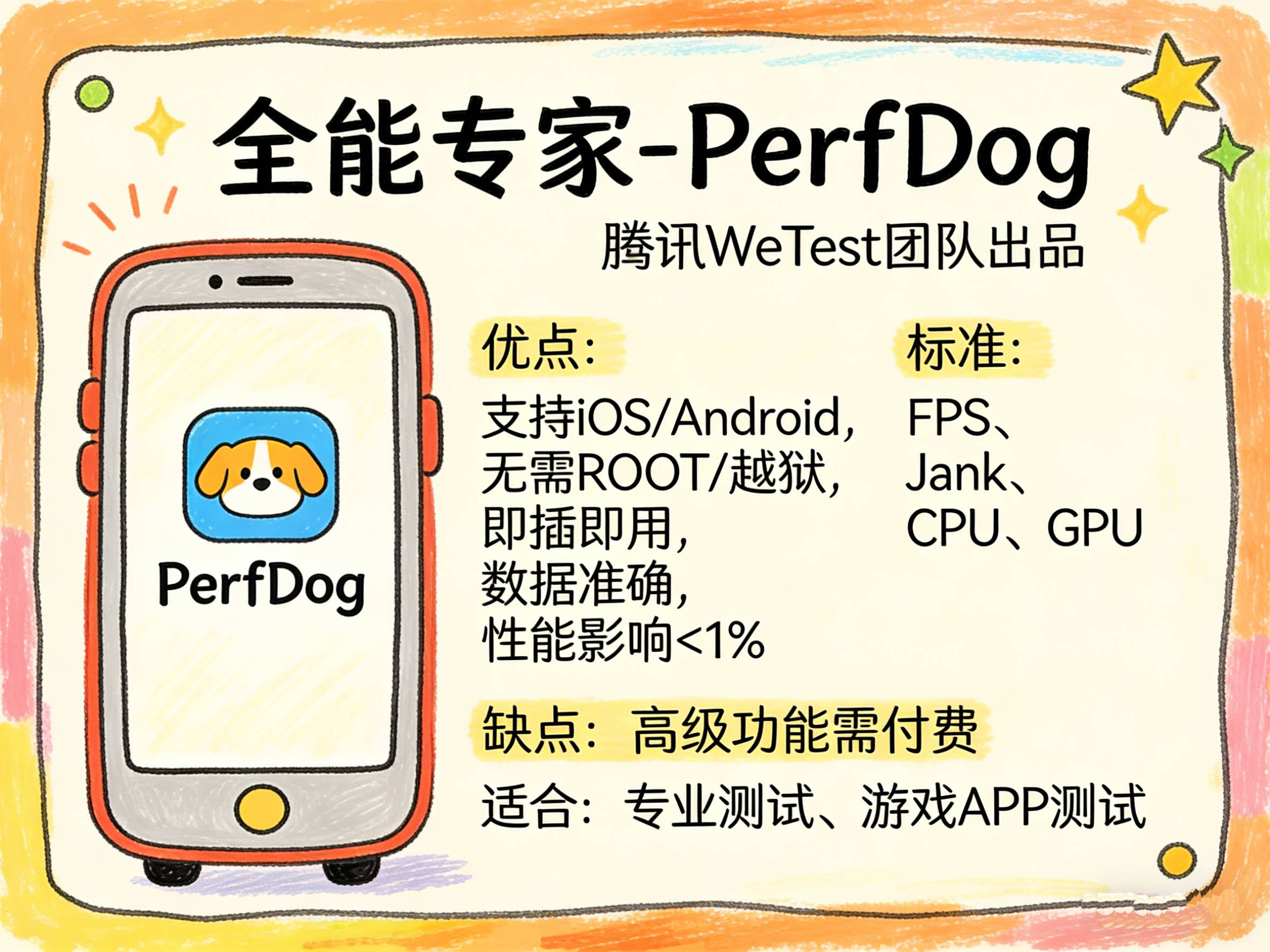 全能专家-PerfDog:腾讯WeTest团队出品,是业内非常知名的商业工具。优点是支持iOS/Android,无需ROOT/越狱,即插即用,数据准确,对手机本身性能影响极小(<1%)。标准非常全面(FPS、Jank、CPU、GPU等)。缺点是高级功能需要付费。适合需要精确数据的专业测试和游戏APP测试。